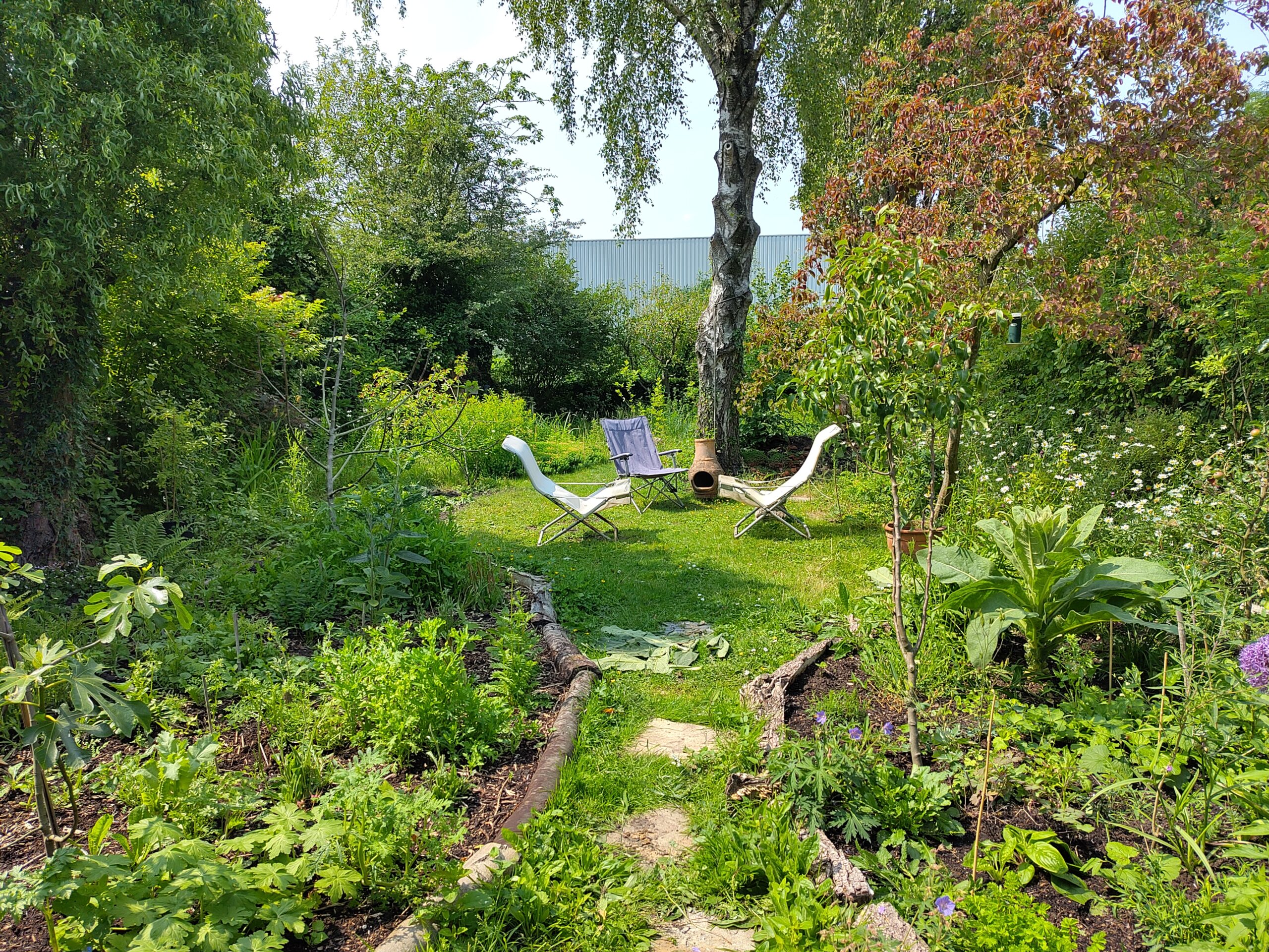 De tuin ligt op een volktuinpark, de Zonnehoek, in het voormalig houthavengebied West. Het is een wilde tuin met soorten als Heemst, Kleine pimpernel, Betonie, Bosandoorn, Salomonszegel, etc. We hebben een grote vijver met o.a. Kattenstaart, Gewone Dotterbloem, Wolfspoot, Knikkend Nagelkruid en Blauwe knoop.