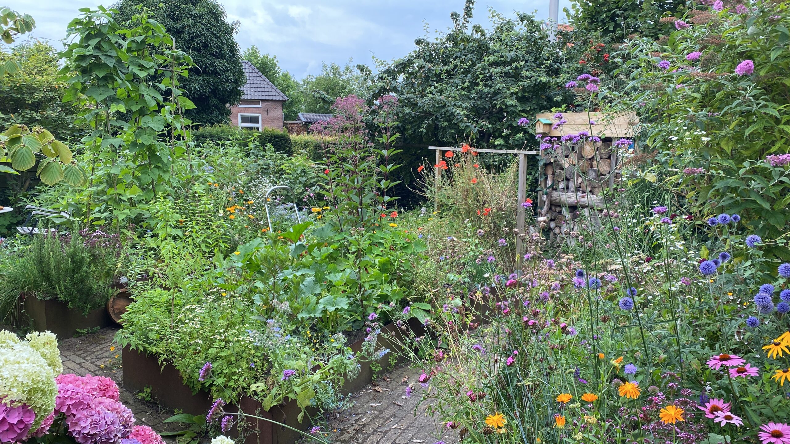 Deels inheemse soorten ( streekmengsel van Cruijdt Hoeck) kruiden heesters en bomen. Hagen. Lijsterbes Liguster Hulst klimop Haagbeuk Wilde rozen Akelei paardenbloem etc