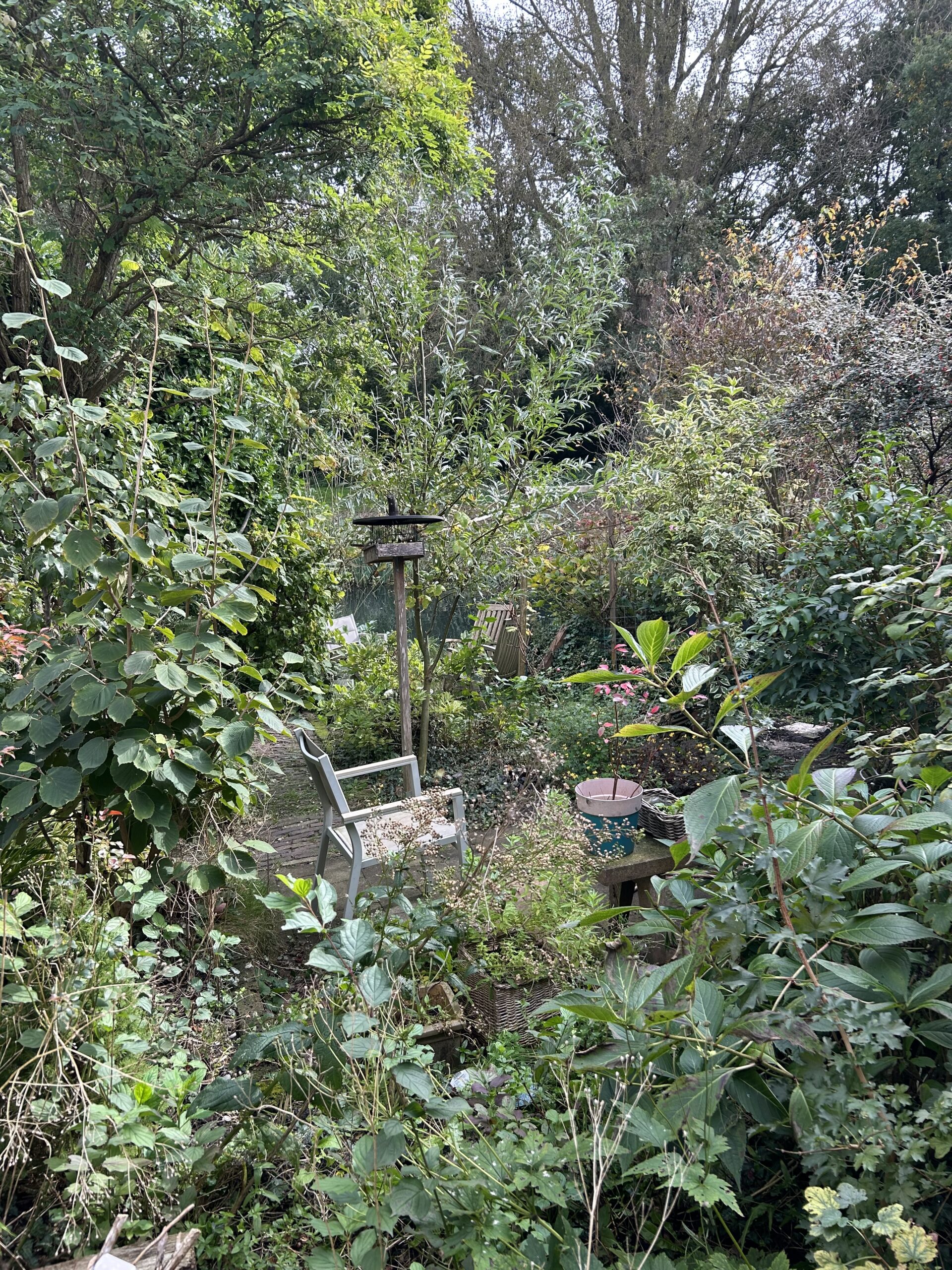 Het is een tuin met hoge, groene en vogelvriendelijke heggen en inheemse planten om insecten te helpen. Daarnaast is zo veel mogelijk eetbaar.