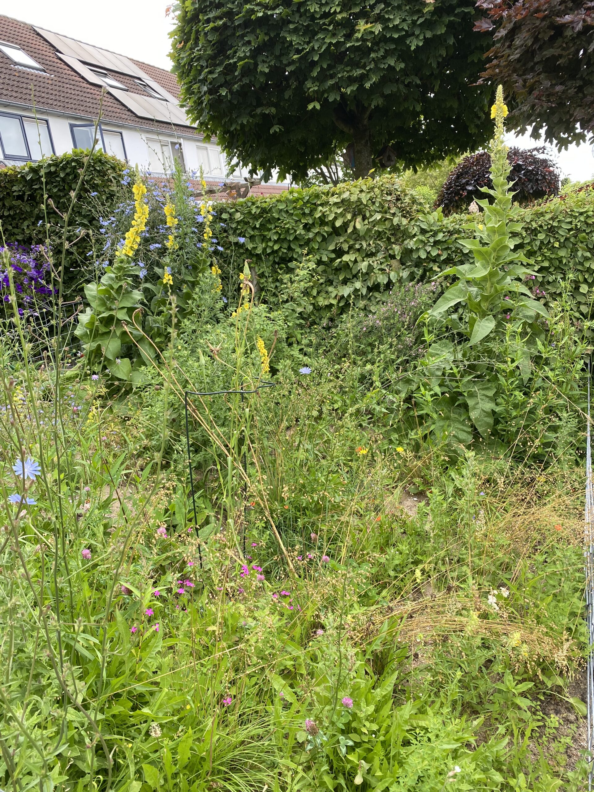 Autochtone planten, opgekweekt uit verzamelde zaden uit Voornes Duin (egelantier, koningskaars, slangenkruid, heelblaadjes, bevertjes, kamgras, reuk gras enz.) en een bosje met meidoorn, sleedoorn en boswilg. Daktuin met soorten die de droge periodes hebben overleefd.