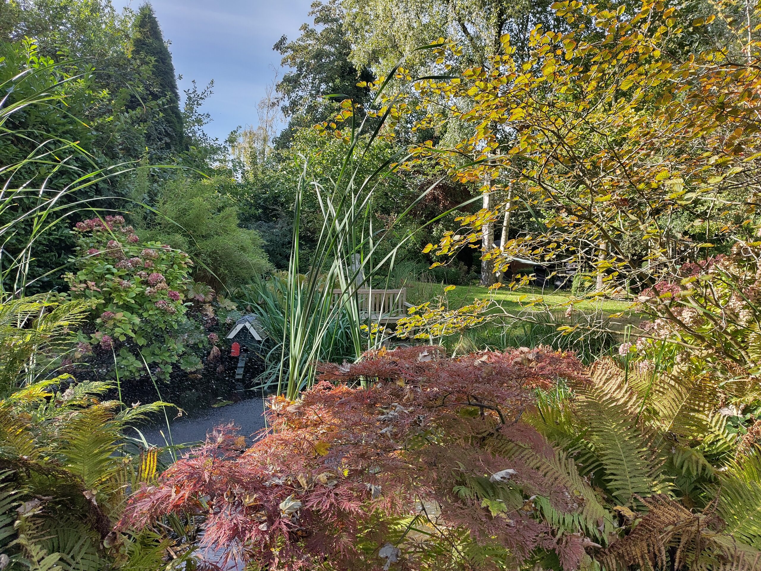 Grote tuin met volwassen bomen, vijver, bloementuin in de voortuin en steeds meer inheemse planten.