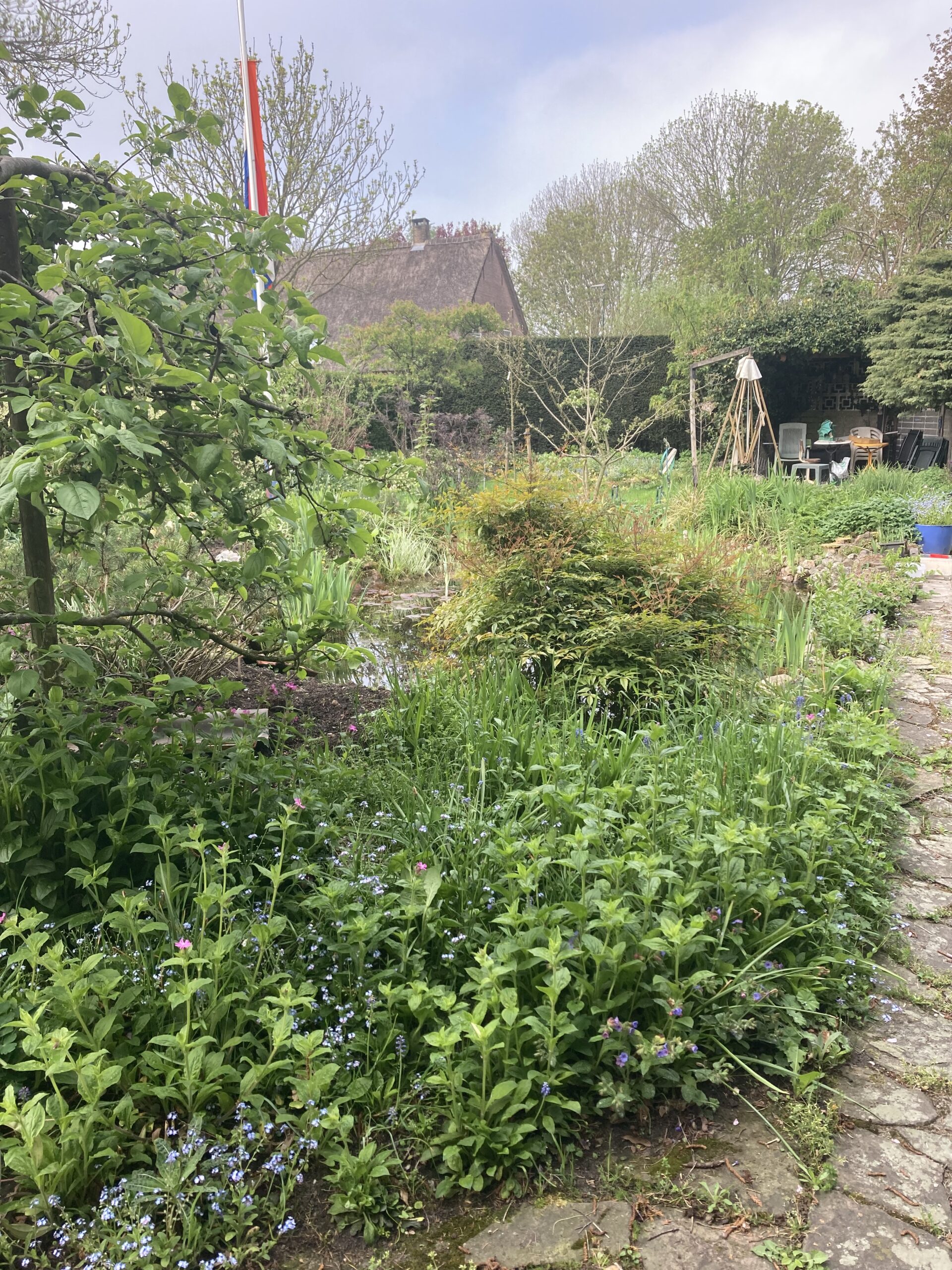 Ligt aan de Giessen in de polder. Het is een oude tuin rond een huis gebouwd in 1956. We wonen hier sinds 1981. Er zijn verwilderde stukken, borders, compost hopen, inheemse en andere planten. Er komen veel vogels, vlinders en andere insecten in de tuin. Grote vijver maar dit jaar voor het eerst zie ik geen kikkers of paden. Planten: kattenstaart, wiederik, wilgenroosje, boterbloem, klaver soorten, paardenbloem soorten, brandnetels, distels, kaardebol, toortsen, ijzerhaard, gaura, rozen.